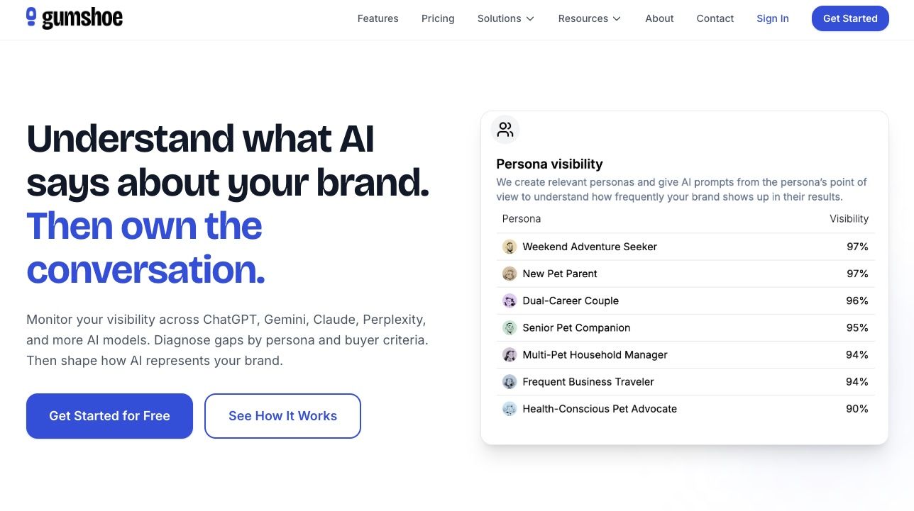 Gumshoe is an AI search visibility platform built around one core idea: measuring how AI talks to real people, not machines. While most tools track visibility by scraping AI outputs from anonymous browser sessions, Gumshoe runs conversations as specific buyer personas. You define your target customer by role, goals, pain points, and decision-making criteria, and Gumshoe simulates how AI responds to that actual person, not a generic anonymous query. The result is visibility data that reflects what your buyers actually see when they ask AI for recommendations.